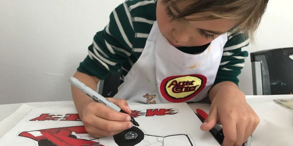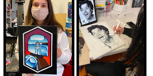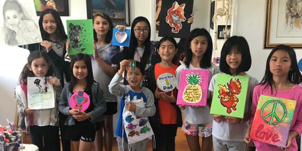 Camps are fun and engaging for all ages. Each student chooses from a large selection of projects: canvas painting, canvas bags, banners, ceramics , watercolors, pastels, colored pencils, markers and various craft projects. Themes come from the student and their own ideas. The instructor guides them and the step by step learning process begins. Each student learns to sketch with our fundamental curriculm listed above. Depending on the age of the child, we take them into a mind set of how the artist "sees" using shapes and patterns of light and dark. Easy, construction and on a pace that helps the student feels at ease. Our lessons are projected on a big screen and easy to follow. The imagination can be taken from the mind and sketched onto paper. Storytelling with pictures come to life using the imagination. When children spend more than 2 hour with us and need a break, students can go in the break room ,relax, take a break, read a book, watch an art video or play an art game.